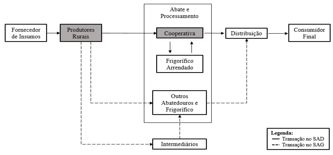 Empiricamente, o estudo demonstrou que os SADs devem ser analisados em sua totalidade, uma vez que a ineficiência nas transações entre quaisquer elos na cadeia poderia comprometer a continuidade de todo o sistema. Ademais, constatou-se que, frente aos conflitos existentes nos SAGs, a cooperativa se constitui em uma alternativa para que os produtores de carne bovina em um SAD possam competir e permanecer na atividade. Distinto das exigências impostas pelos sistemas convencionais em termos de escala e custo, verificou-se que a cooperativa proporcionou a continuidade dos produtores na atividade, tanto pela sua capacidade em admitir produtores de diferentes níveis tecnológicos quanto pelos mecanismos financeiros. Entretanto, foram observadas falhas na remuneração do valor gerado, as quais podem causar ineficiências nesses subsistemas, podendo comprometer a continuidade do mesmo.