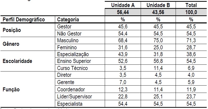 Em relação aos trabalhadores que ocupam posição de gestor e não gestor, 71,30% são do sexo masculino e 28,70% feminino e, dentre estes, 54,50% possuem ensino superior, 38,60% especialização e 6,90% curso técnico. Dos participantes da pesquisa, 54,50% possuem a função de especialista (considerados não gestores) e 23,70% possuem a função de supervisor/líder, 11,90% de coordenador, 5,90% de gerente e 4,00% de diretor (considerados gestores).