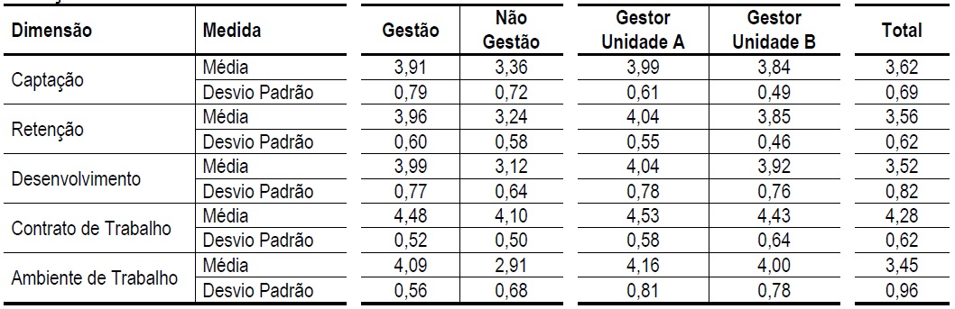 A partir do conjunto de dados obtidos junto ao estudo, foi possível evidenciar uniformidade quanto ao nível de percepção das práticas de GP em ambos os grupos, trabalhadores com posição de gestão e não gestão. No entanto, ainda que as unidades A e B possuam práticas de GP implantadas, demonstrou-se desconformidade quanto às práticas de GP em relação ao nível de percepção dos trabalhadores com posição de gestão entre unidades.