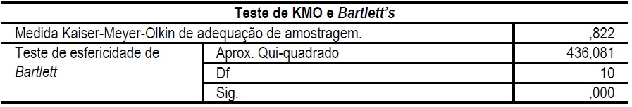 Por meio do teste Kaiser-Meyer-Olkin [KMO], que determina a adequação amostral no que concerne ao grau de correlação parcial, variando de 0 a 1, percebe-se que KMO próximo a 1 indica que é muito adequada a utilização da técnica de Análise Fatorial [AF]. Em contrapartida, valores próximos a 0 refletem em correlação fraca entre as variáveis. Destaca-se que, para a correta utilização da Análise Fatorial, o KMO deve ser no mínimo de 0,6 (Bezerra, 2009; Fávero et al., 2009; Hair Jr. et al., 2009).