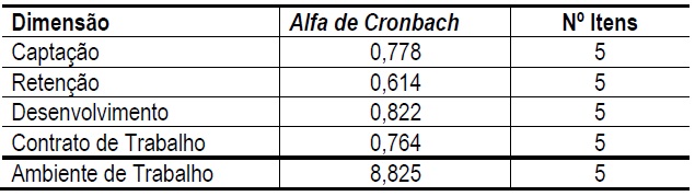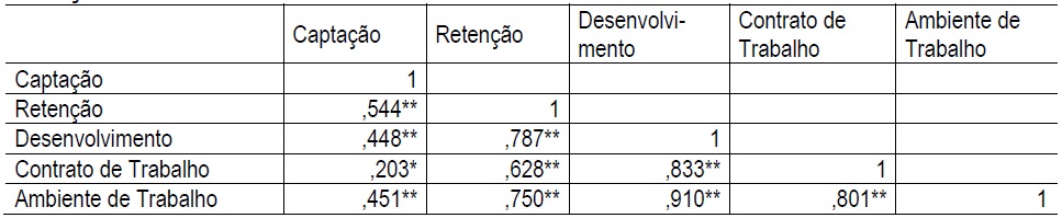 Com base em Franzblau (1958), pode-se considerar que as correlações entre as dimensões foram: Captação e contrato de trabalho consideradas como fraca (Se 0,20 < | ρ | < 0,40, a correlação é fraca); Captação e retenção, captação e desenvolvimento, captação e ambiente de trabalho são moderados (Se 0,40 < | ρ | < 0,60, a correlação é moderada); Desenvolvimento e retenção, contrato de trabalho e retenção, ambiente do trabalho e retenção e contrato de trabalho consideradas como forte (Se 0,60 < | ρ | < 0,80, a correlação é forte); Desenvolvimento e contrato de trabalho, desenvolvimento e ambiente de trabalho e contrato de trabalho e ambiente de trabalho possuem correlação muito forte (Se | ρ | > 0,80, a correlação é muito forte).