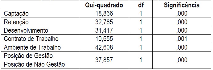 O teste de Wilcoxon-Mann-Whitney e Kruskal-Wallis mostrou que trabalhadores com posição de gestão não apresentam percepção diferenciada das práticas de GP do que trabalhadores de posição não gestão. A hipótese nula não é aceita, ou seja, os testes demonstraram que não há nível de percepção diferenciada entre um grupo e outro. Esta conclusão está evidenciada na Tabela 6, na medida em que o teste Qui-quadrado apresentou o valor χ²(2)=37,857 e a significância da constante apresentou p-value de 0,000 (ρ < 0,05) para o modelo. De acordo com Hair Jr. et al. (2009), o teste Qui-quadrado serve para avaliar quantitativamente a relação entre o resultado de um experimento e a distribuição esperada para o fenômeno. Segundo Fávero et al. (2009), a significância estatística de um resultado representa a probabilidade de erro envolvida em aceitar o resultado observado como válido, onde o valor do nível - . representa um índice decrescente da confiabilidade de um resultado.