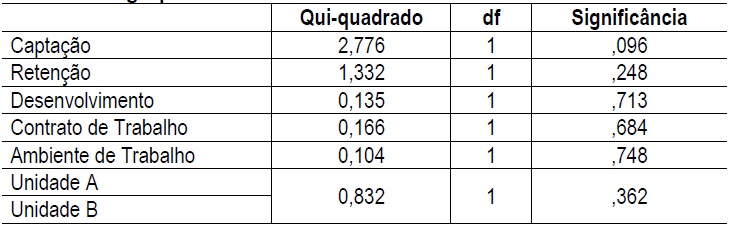 O teste de Wilcoxon-Mann-Whitney e Kruskal-Wallis mostrou que trabalhadores com posições de gestão da unidade A possuem nível de percepção diferenciada das práticas de GP que trabalhadores com posições de gestão da unidade B. Neste caso, aceita-se a hipótese nula, ou seja, os testes demonstraram que há percepção diferenciada entre um grupo e outro. O resultado está evidenciado na Tabela 7, na medida em que o teste Qui-quadrado apresentou o valor χ²(2)=0,832 e a significância da constante apresentou p-value de 0,362 (ρ > 0,05) para o modelo. A Tabela 8 mostra que as hipóteses testadas nesta pesquisa foram: