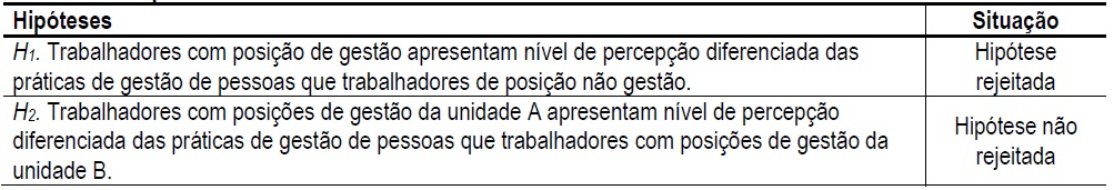Hipótese 2.Trabalhadores com posições de gestão da Unidade A apresentam nível de percepção diferenciada das práticas de gestão de pessoas que trabalhadores com posições de gestão da Unidade B.