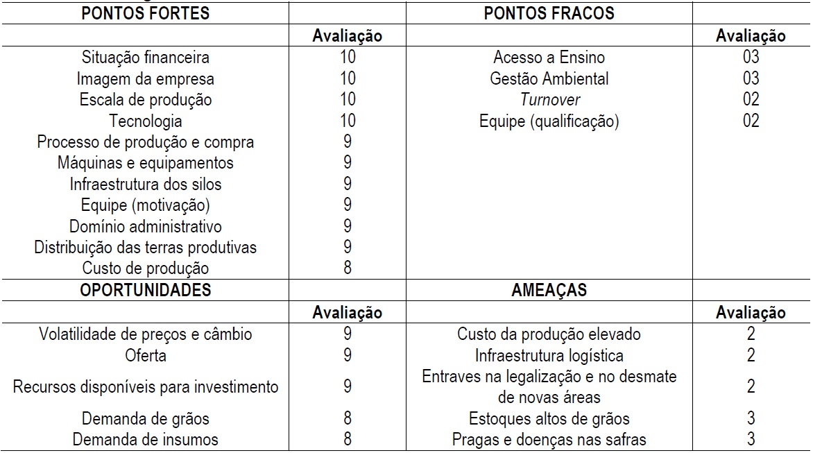 O ranking das variáveis da análise SWOT exposta no caso foi realizado num comparativo entre a empresa e a concorrência, por conta disso, a avaliação de cada item é uma nota que correlaciona o seu desempenho em relação à concorrência. Neste sentido, é possível observar que os itens avaliados com a nota 10 representam que a Tierra Nova é benchmark no mercado. Dentre os pontos fortes relacionados, por exemplo, tecnologia pode ter destaque e é um fator considerado essencial para os ganhos de produtividade e custos, sob a ótica das características do setor. Em oportunidade, os recursos disponíveis para investimento são acessíveis não só pelos créditos voltados para área, já que 20% do PIB do país vem da agricultura, como da credibilidade da empresa construída nos anos de atuação.