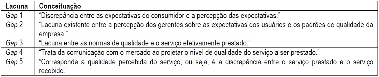 O tamanho dos gaps tende a impactar positivamente ou negativamente na qualidade do serviço prestado e cada lacuna influencia de uma maneira diferente a percepção do nível de qualidade do produto (Parasuraman et al., 1985). Portanto, a diferença entre a expectativa e a percepção sobre o serviço serve como mensuração da qualidade do serviço (Santos & Santos, 2017).