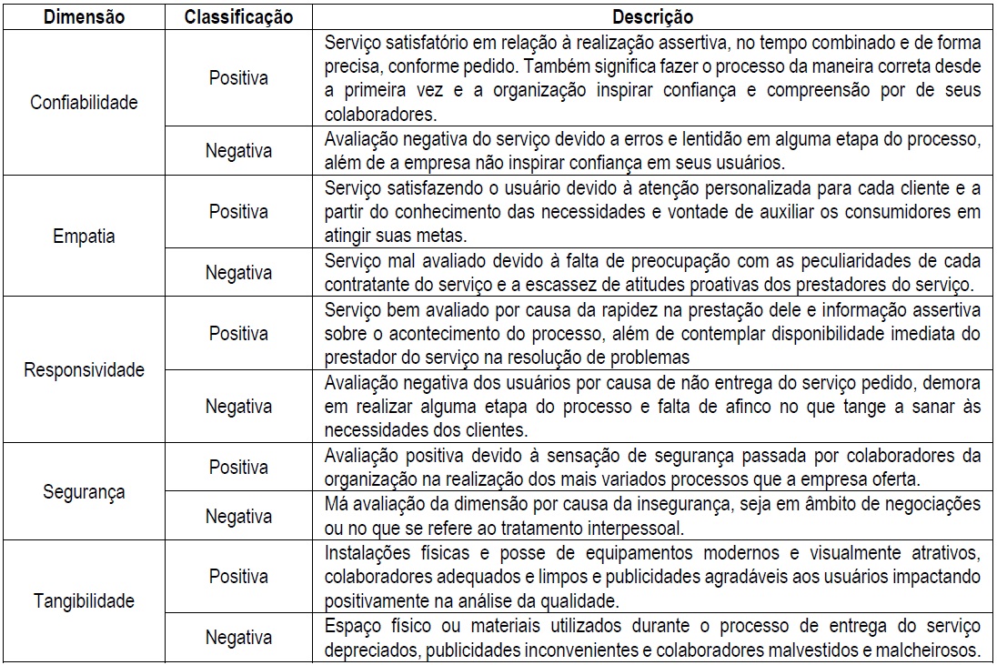 Maia e Alencar (2017) dissertam que é a partir de algumas dimensões que os clientes irão julgar o prestador do serviço. Neste sentido, Fonseca (2008) afirma que essas dimensões da qualidade podem variar de acordo com o tipo de serviço ofertado. Para Chowdhary e Prakash (2007), a proposição do serviço pode ser construída ao redor de uma única dimensão, transformando-a numa peça chave do processo. Dessa forma, para a análise da qualidade do serviço ofertado, foram observadas dimensões genéricas inerentes aos mais variados tipos de serviço.