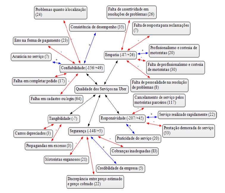 Em suma, com o objetivo de sintetizar a análise de dados realizada, a Figura 4 apresenta os principais fatores identificados e suas dimensões, destacando, além das frequências de cada fator, as relações positivas em azul e negativas em vermelho. Em complemento, a Figura 5 expõe uma descrição geral sobre os principais pontos positivos e negativos encontrados em cada dimensão da qualidade na Uber.