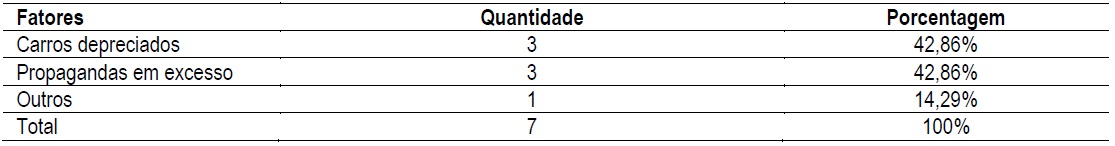 Carros depreciados foi um dos fatores mais mal avaliados nesse quesito, que é complementado pela falta de cuidado dos motoristas com a aparência física, como se vê no comentário 162: “Alguns carros estão bem velhos e motoristas com aparências no vestuário bem descuidados na limpeza pessoal”. E ainda, o excesso de propagandas faz com que a Uber importune os seus clientes, conforme comentário 219: “Já tenho o App instalado e faço uso frequente, mas ñ aguento mais a propaga da Uber no meu aparelho, está se tornando um transtorno... toda hora aparece na minha tela”.