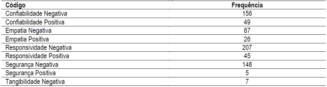 Nesta seção, apresenta-se a análise dos dados de acordo com a descrição das características de cada dimensão feita por Parasuraman et al. (1985, 1988). Ressalta-se que os comentários que serviram de base para a análise não sofreram nenhum tipo de tratamento gramatical, sendo expostos da maneira que foram escritos pelos usuários, a fim de preservar todas as suas características e sentidos. A frequência de comentários de cada dimensão está apresentada na Tabela 1.