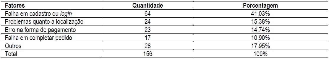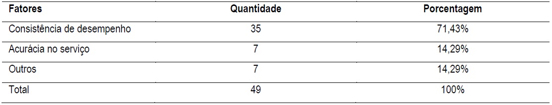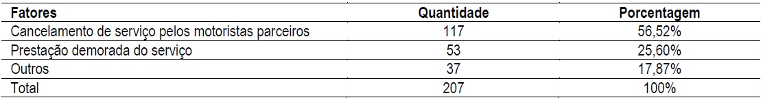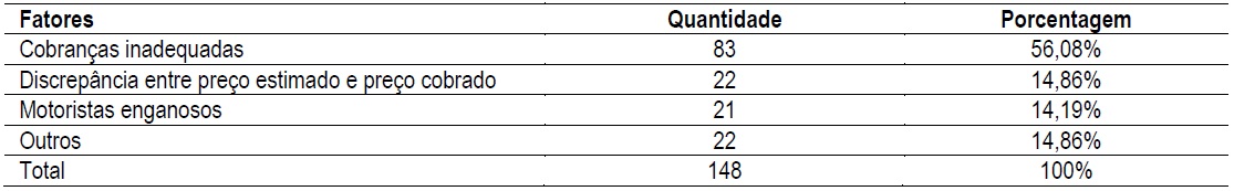A dimensão de confiabilidade, resumidamente, diz respeito à prestação do serviço de forma confiável e com acurácia desde a primeira vez em que o serviço é ofertado, cumprindo o prometido e sendo consistente em seu desempenho (Parasuraman et al., 1985). Destarte, a partir das 156 referências na categoria confiabilidade negativa, foi possível fazer a Tabela 2, que mostra a frequência de fatores que implicaram no julgamento ruim do serviço da Uber.