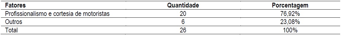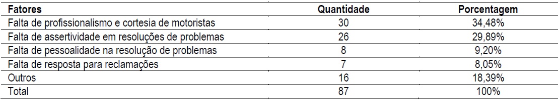 A falta de profissionalismo e cortesia por parte dos motoristas, que consiste em atitudes rudes de motoristas parceiros com seus clientes ou motoristas que cancelaram corridas sem se importar com as necessidades do consumidor, forma um dos fatores que influencia negativamente no julgamento da qualidade da empresa, como é exposto no comentário 149: “Cancelam a viagem sem saber se é alguma urgência, claro que não é problema deles, mas no mínimo deveriam dar satisfação, já que quando é o usuário que cancela a viagem somos cobrados”.