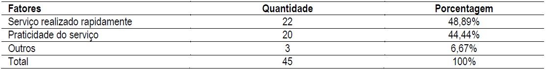 Já em relação à análise dos fatores classificados como responsividade positiva, conforme a Tabela 7, a rapidez do serviço foi o fator mais bem avaliado, como exemplifica o comentário 194: “Excelente opção para quem precisa de se locomover com rapidez.”