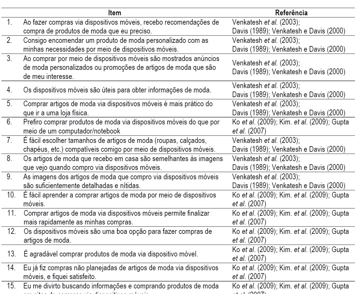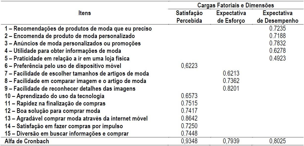 Em relação à estrutura utilizada como base para a construção do instrumento, o estudo aqui exposto vem ao encontro do que foi exposto por Venkatesh, Morris, Davis e Davis (2003), ao afirmar as dimensões de Expectativa de Esforço e Expectativa de Desempenho como relevantes para a percepção dos usuários de m-commerce de moda. Além disso, a dimensão de Satisfação Percebida também se confirma como um fator relevante, assim como proposto por Hoffman, Novak & Duhachek (2003). Os autores afirmam que a satisfação é um antecedente importante do uso da internet móvel. Além disso, os itens representaram corretamente cada dimensão, assim como previsto. A tabela 2 resume os resultados encontrados na análise fatorial exploratória feita; nela são indicados os 15 itens de interesse, além de cada uma das dimensões nas quais eles devem se agregar e formar um grupo representativo da percepção do usuário sobre comercio eletrônico móvel de moda.