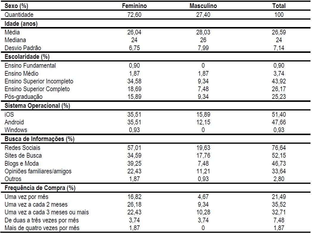 A amostra foi composta por 110 indivíduos que afirmaram utilizar dispositivos móveis para fazer compras de artigos de moda. Sendo assim, a Tabela 1 traz um resumo estatístico a respeito da idade, escolaridade, sistema operacional de dispositivo móvel utilizado, forma de busca por informações e frequência de compra dos respondentes, dividido por sexo, além dos resultados totais de cada estrato.