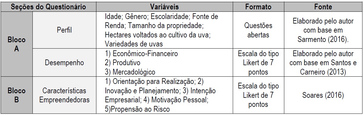 O instrumento foi construído com base na revisão de literatura, sendo que, no bloco A, as questões de perfil foram elaboradas com base em Sarmento (2016) e as questões sobre o desempenho com base em Santos e Carneiro (2013), realizando as adaptações pertinentes ao contexto vitivinícola. Já o bloco B, referente às características empreendedoras, é composto pela escala de Soares (2016). As escalas utilizadas para mensurar o desempenho e as características empreendedoras são do tipo Likert de 7 pontos. O instrumento de pesquisa utilizado pode ser acessado na íntegra no estudo de Caliari (2018).