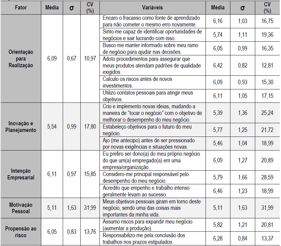Nesta seção, são apresentadas as análises das características empreendedoras dos produtores de uva. A Tabela 1 expõe os resultados de média, desvio padrão (σ) e coeficiente de variação (CV) dos cinco fatores e das quinze variáveis da escala de características empreendedoras, em que 1 refere-se a “discordo totalmente” e 7 a “concordo totalmente”.