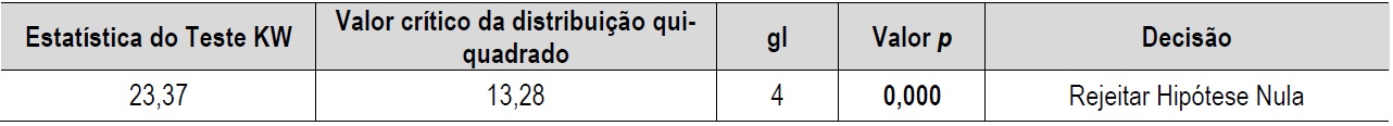 Utilizou-se do Teste Kruskal-Wallis para verificar se há diferenças significativas entre os conjuntos de características empreendedoras na amostra de produtores de uva respondentes, isto é, verificar se os vitivinicultores apresentam graus de empreendedorismo distintos entre os fatores de Orientação para Realização, Inovação e Planejamento, Intenção Empresarial, Motivação Pessoal e Propensão ao Risco, a um nível de significância de 5%.