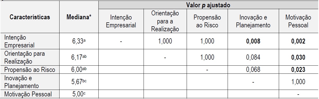 O teste apontou quatro diferenças em um nível de significância de 5%. As características Intenção Empresarial, Orientação para Realização e Propensão ao Risco não possuem diferenças significativas entre si, porém apresentaram diferença significativa de medianas em relação à característica Motivação Pessoal. Além disso, a característica Intenção Empresarial, que apresentou, em valores absolutos, a maior mediana entre as características, também apresenta diferença significativa para a característica “Inovação e planejamento”.