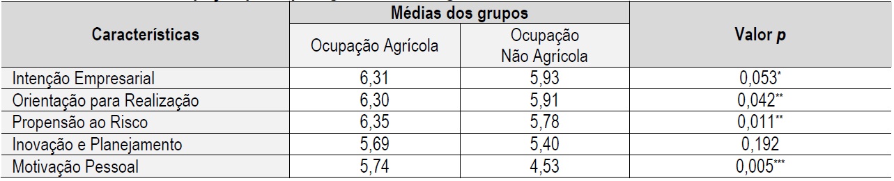 Identifica-se que quatro dos cinco conjuntos de características empreendedoras apresentaram diferenças significativas entre os grupos, sendo que os dois grupos amostrais não possuem diferenças entre si apenas quanto ao fator “Inovação e Planejamento”. Portanto, com base nas médias dos grupos e no valor ., pode-se concluir que os produtores que possuem apenas a agropecuária como ocupação apresentam médias de características empreendedoras de “Intenção Empresarial”, “Orientação para Realização”, “Propensão ao Risco” e “Motivação Pessoal” superiores aos produtores que tem outra ocupação além da propriedade agropecuária.