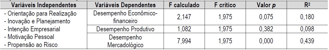 Considerando um nível máximo de significância de 10%, pode-se verificar que apenas o modelo de desempenho produtivo como variável dependente não foi significativo. A partir da análise dos parâmetros, ressalta-se que as características empreendedoras explicam, em conjunto, 18% do desempenho econômico-financeiro e 43,9% do desempenho mercadológico dos produtores de uva respondentes, mantendo os demais fatores constantes. Nesse sentido, evidencia-se a relação existente entre as características empreendedoras e o desempenho de produtores de uva da região da Campanha Gaúcha do Brasil.