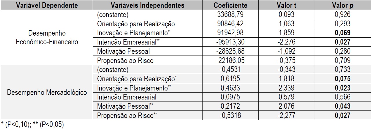 Já a Tabela 6 apresenta os coeficientes dos modelos de regressão para desempenho econômico-financeiro e mercadológico. Destaca-se que o desempenho econômico-financeiro foi mensurado em reais (R$), enquanto o desempenho mercadológico e as características empreendedoras foram mensurados em escalas de concordância tipo Likert de sete pontos.