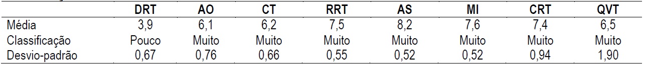 Na análise da Tabela 7, percebe-se que a amostra estudada indica possuir muita Qualidade de Vida no Trabalho (média = 6,5), sugerindo que os profissionais estudados percebem o seu trabalho como um meio de se obter satisfação. Este resultado se dá principalmente pelos achados na dimensão Motivação Intrínseca (média = 7,6) e Apoio Organizacional (média = 6,1). De acordo com Martínez, Suárez, Cabrera, García e Tapia (2007), a satisfação em seu trabalho é uma das variáveis mais importantes relacionadas com o comportamento organizacional e qualidade de vida. Na Tabela 8, consta a classificação das três dimensões (fatores) do QVP-35 e a dimensão da QVT.