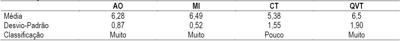 Ao analisar a Tabela 8, percebe-se que a dimensão que teve maior pontuação foi a Qualidade de Vida no Trabalho (média = 6,5), classificada como “muito”. Quanto às demais três dimensões do QVP-35, nota-se que o Apoio Organizacional e a Motivação Intrínseca também estão classificadas como “muito”, ou seja, levando ao entendimento de que estes fatores levam à percepção de alta qualidade de vida no trabalho.