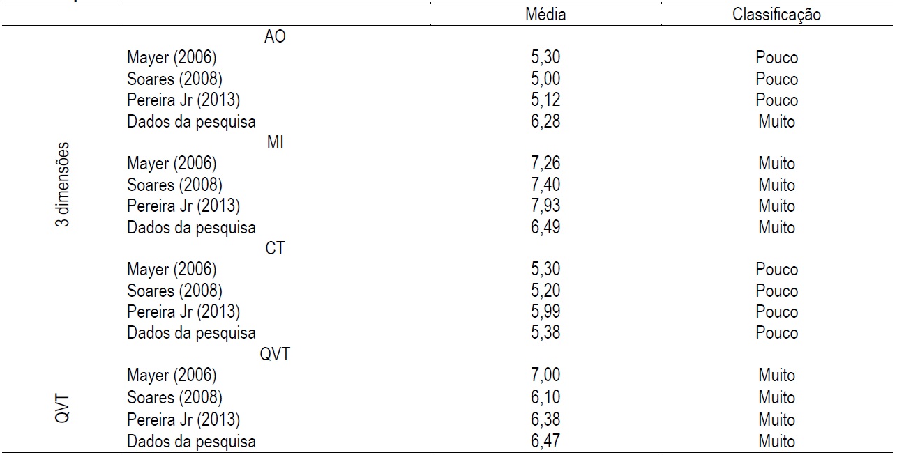 Com o intuito de comparar os achados desta pesquisa com os resultados de estudos precedentes que utilizaram o questionário QVP-35 para avaliar a Qualidade de Vida no Trabalho, os dados estão apresentados a seguir na Tabela 9. Cabe citar que o estudo de Mayer (2006) foi realizado em policiais militares; Soares (2008) em trabalhadores de uma instituição universitária; e Pereira Jr. (2013) em médicos. Contudo, muito embora as amostras pesquisadas sejam diferentes, suas comparações são realizadas com a devida cautela.