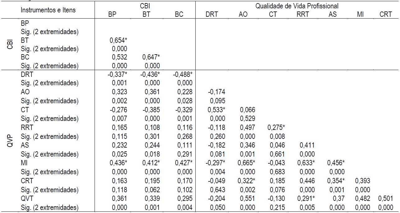 Ao analisar a correlação das três dimensões de CBI entre si, percebe-se uma correlação significativa positiva moderada. No que diz respeito à correlação entre as oitos dimensões da Qualidade de Vida Profissional, a dimensão “Desconforto Relacionado ao Trabalho” demonstrou uma baixa correlação significativa negativa com a “Motivação Intrínseca” (r. = -0,297; p = 0,004) e a “Qualidade de Vida no Trabalho” (r. = -0,204; p = 0,050), assim, quanto maior o “Desconforto Relacionado ao Trabalho”, menor é a “Motivação Intrínseca” e a “Qualidade de Vida no Trabalho”. A “Carga de Trabalho” demonstrou uma correlação moderada significativa positiva com o “Desconforto Relacionado ao Trabalho” (r. = 0,533; p = 0,000), significando que, quanto maior a “Carga de Trabalho”, maior o “Desconforto Relacionado ao Trabalho”. O “Apoio Organizacional” demonstrou uma moderada correlação significativa positiva com a “Motivação Intrínseca” (r. = 0,665; p = 0,000), assim, quanto maior o “Apoio Organizacional”, maior é a “Motivação Intrínseca”.