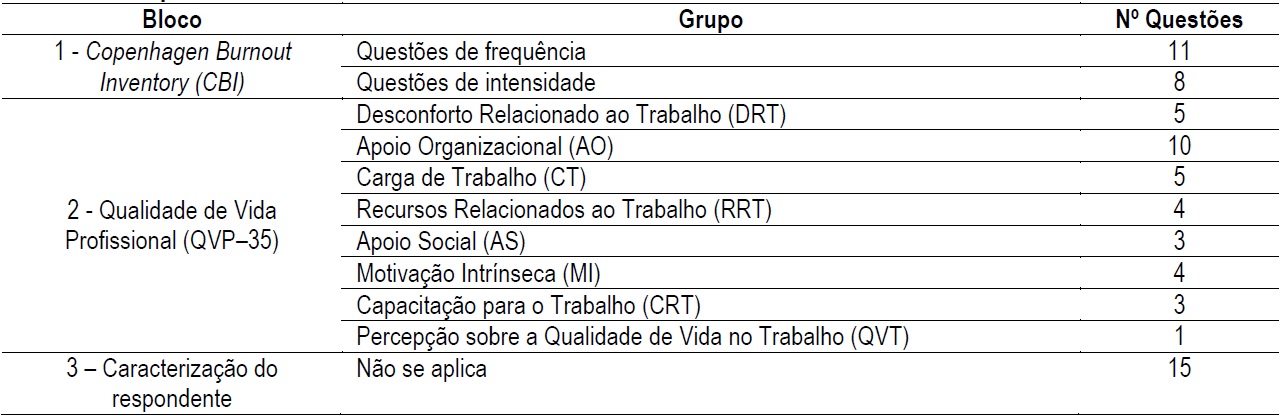 O questionário é composto de três blocos: o primeiro refere-se à Síndrome de Burnout, o segundo diz respeito à Qualidade de Vida Profissional e o terceiro é referente à caracterização dos respondentes.