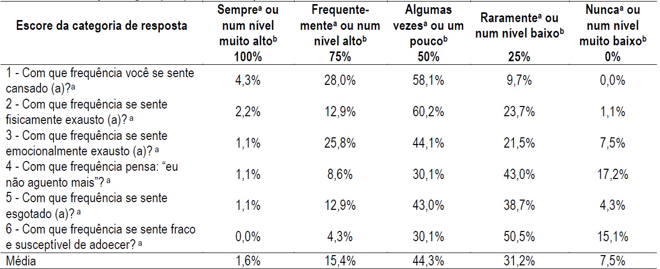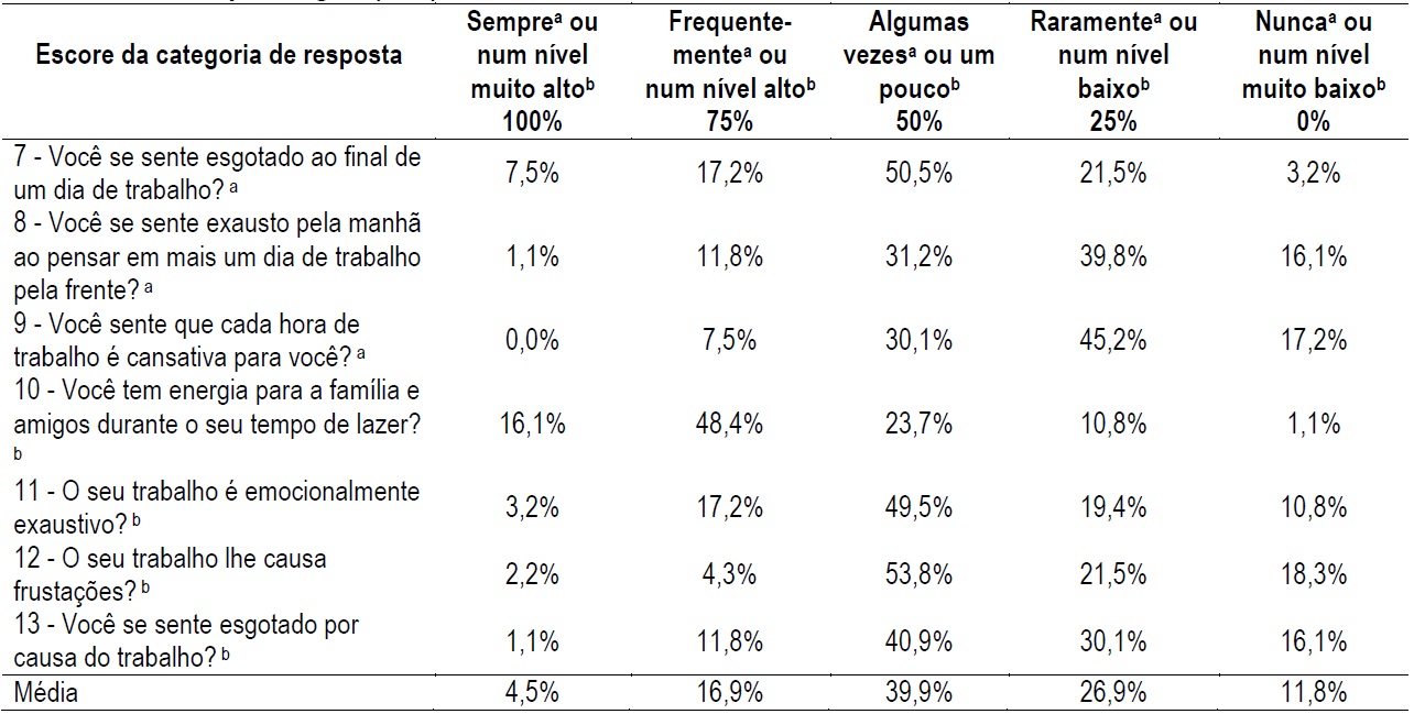 Observa-se, na Tabela 2, que na maioria das respostas (média de 44,3%) prevalece o escore 50% (algumas vezes ou um pouco), o qual, neste estudo, é considerado uns dos níveis baixos de Burnout. Em relação às perguntas, nota-se que, a que teve maior frequência de respostas no escore 50%, foi a pergunta 2, com 60,2%, seguida da pergunta 1 (58,1%). A Tabela 3 diz respeito ao Burnout relacionado ao trabalho, o qual é definido como o grau de fadiga e exaustão física e psicológica vivenciado no trabalho (Kristensen et al., 2005).