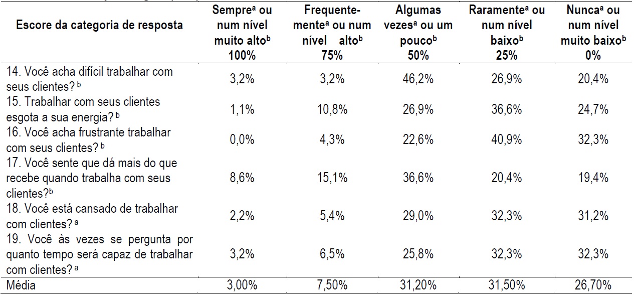Percebe-se, na Tabela 4, que a maioria das respostas (31,5%) se concentra no escore 25%. Ao verificar as perguntas, nota-se que, em relação à questão 14, 46,2% dos participantes consideram um pouco difícil trabalhar com seus clientes e 40,9% acham, em um nível baixo, frustrante trabalhar com seus clientes.
