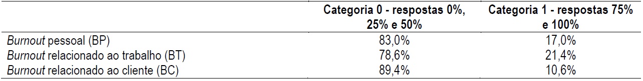 O CBI não define um ponto de corte, pois seus autores consideram que pode ocorrer Burnout em um nível muito alto até um nível muito baixo. Portanto, para fins de análise dos dados, neste estudo, considerou-se agrupar as categorias em categoria zero (0) para os itens relativos aos escores 0, 25 e 50% respectivamente, considerando esses os níveis mais baixos; e categoria um (1) para os itens relativos aos escores 75 e 100%, respectivamente, considerando esses os níveis mais altos.