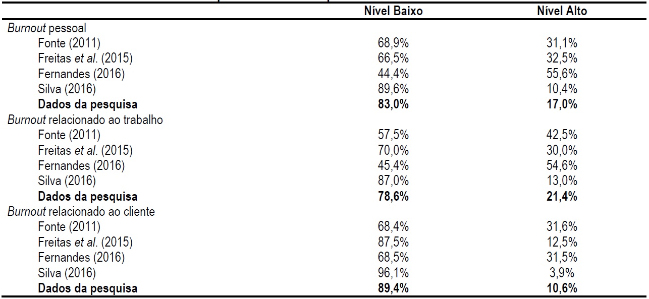 Ao comparar os dados desta pesquisa com estudos precedentes de Silva (2016), Fernandes (2016) e Freitas et al. (2015), verificou-se os menores níveis de Burnout no constructo de Burnout relacionado ao cliente. Já no estudo de Fonte (2011), o menor nível se apresentou no constructo Burnout pessoal. Ao comparar os níveis mais elevados de Burnout, observa-se que, nos estudos de Silva (2016) e Fonte (2011), o percentual mais elevado está no constructo Burnout relacionado ao trabalho, com 13% e 42,5% respectivamente. No estudo de Fernandes (2016) e Freitas et al. (2015), o constructo com nível mais elevado é o Burnout pessoal com 55,6% e 32,5% respectivamente.