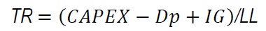 [Eq. 11]Onde: TR: Taxa de Reinvestimento; Dp: Depreciação; IG: Investimento em Giro; LL: Lucro Líquido; VPLFCpe: VPL do Fluxo de Caixa no Período Explícito; VPLFCp: VPL do Fluxo de Caixa na Perpetuidade.