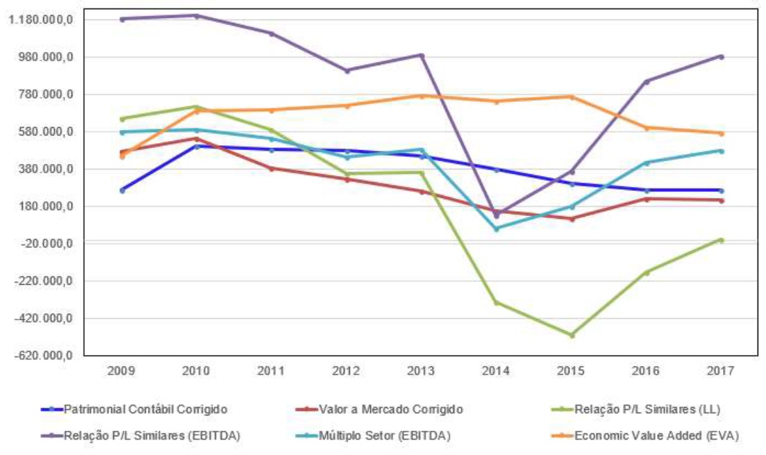 Na Tabela 11 foram dispostos todos os valores de mercado mensurados pelas múltiplas dimensões de valuation, demonstrando o quão são mutáveis uns dos outros e dependentes de premissas assertivas, apesar de alguns modelos seguirem a mesma tendência de queda ou alta. Vários fatores poderão interferir na análise, desde condições do cenário macroeconômico como variáveis do próprio negócio. Percebe-se, na Figura 1, que os métodos Relação P/L (EBITDA) e Relação P/LL entre Similares e o modelo Múltiplo do Setor (EBTDA), apesar de se divergirem nos valores absolutos, seguem a mesma tendência de alta e queda. Verifica-se que a ressalva quanto aos múltiplos de EBITDA em relação a supervalorização do valor da empresa no método Relação P/E pôde ser reafirmada (Martelanc, Pasin, & Cavalcante, 2005).