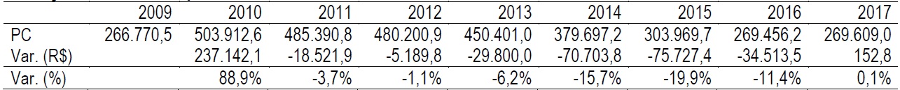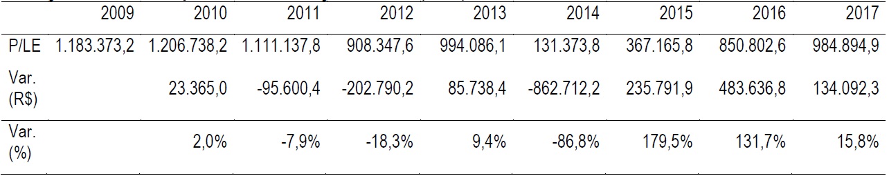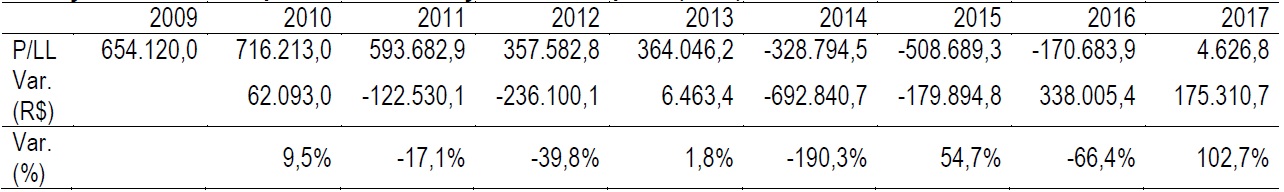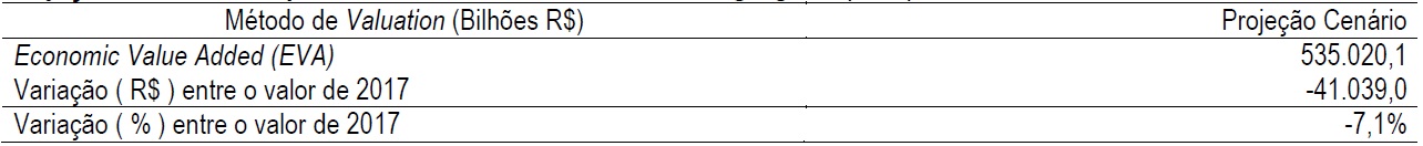 Considerando o modelo baseado no Lucro Econômico, a Petrobras concretizou uma queda, ou seja, uma perda de valor na ordem de 25,6%, quando comparado o valor de 2017 com 2013 (Tabela 8), mas nas projeções de resultados no horizonte dos próximos 10 anos, período de 2018 a 2027, diante de cenário realista com uma taxa de desconto esperada de 11,6%, e considerando a estrutura operacional e de recursos atuais que constituem a empresa, seu valor cai em 7,1% comparado ao valor calculado em 2017.