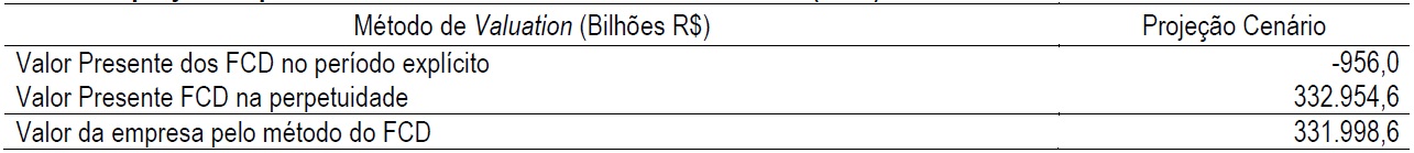 Considerando os benefícios econômicos esperados de caixa, o risco associado aos resultados previstos e o retorno requerido, a empresa consegue gerar valor pelo FCD ou CFF satisfatório, maior 54% que o Valor de Mercado apurado em 2017, assim demonstrando a continuidade em sua operação, projetada num cenário de crescimento médio de 5,4%. Essa análise do valuation pelo FCD (forecast) foi realizada e composta por premissas adotadas diante do referencial teórico indicado e diante dos potenciais operacionais atuais da empresa, e poderão variar de acordo com novos critérios e premissas.