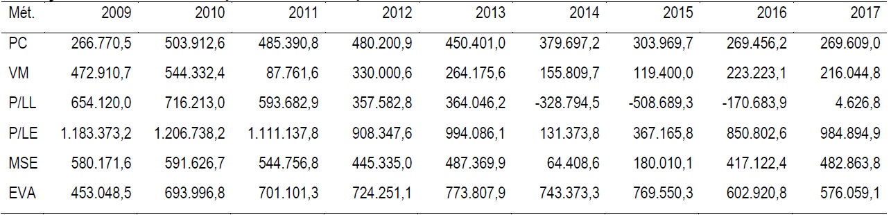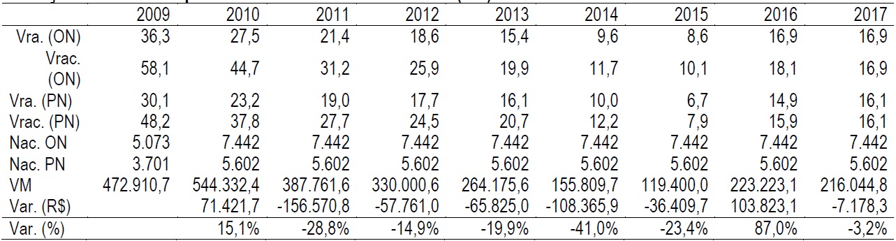 O método de Valor de Mercado tem como premissa básica a Teoria de Eficiência do Mercado e apura o valor de mercado da empresa pela variação da cotação dos preços das ações em consonância com a expectativa dos investidores. Na Tabela 2, calculou-se o Valor de Mercado, considerando as ações outstanding ON e PN da Petrobras. Este método apresentou grande volatilidade ao longo do período avaliado, e pode-se dizer que a empresa também vem perdendo valor, quando comparado com o ano de 2010, quando atingiu seu auge, acentua-se uma queda de 60%.