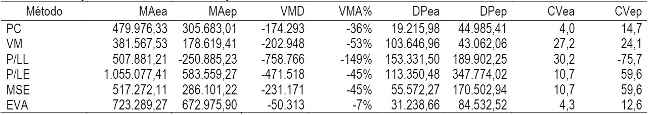 A Tabela 12 relaciona a variação entre as médias aritméticas entre o período ex-ante (2010 a 2013) e ex-post (2014 a 2017), demonstrando as variações percentuais negativas de queda, em todas as métricas, com maior variação nos métodos de Relação P/L Similares (LL), que apresentou uma queda de 149% e o Valor de Mercado com uma queda de 53%.