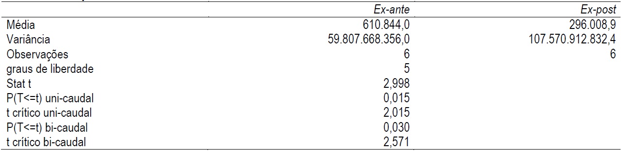 Na Tabela 13 foi empregado o teste t com o objetivo de testar a hipótese H1 a um nível de significância de 0,05. Foi executado o teste das diferenças entre as médias aritméticas pareadas no período ex-ante (2010 a 2013) e ex-post (2014 a 2017), que rejeitou a H0 (hipótese nula) e evidenciou a H1 (hipótese alternativa), indicando teoricamente a existência real e significativa da variação entre as médias dos períodos determinados pelo valor de P bi-caudal de 0,03 e, portanto, a deterioração do valor da empresa.
