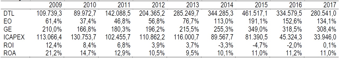 Conforme a definição de Assaf Neto (2012) o ROA (Return on Assets), indica a “taxa de retorno gerado pelas aplicações realizadas por uma empresa em seus ativos. Indica o retorno gerado por cada $ 1,00 investido pela empresa”, o retorno sobre os ativos da Petrobras saiu de uma média de 14% antes de 2014 para uma média de 11% após este período, indicando a ineficiência da empresa em gerar rentabilidade com seus ativos. O ROI (Return On Investment), retorno sobre os investimentos, é um indicador de desempenho econômico empregado tanto na constituição da taxa de crescimento quanto na avaliação da geração de valor (Copeland et al., 2006; Assaf Neto, 2012). Sua composição pode ser realizada pela segregação em giro e margem operacional. Comparando as médias entre os períodos antes e depois de 2014, tem-se 7% contra -2,5%, ou seja, uma variação negativa de 135%, sinalizando seu baixo desempenho econômico. O grau de dependência de endividamento da empresa em relação ao capital de terceiros saiu de uma média de 194% para 308% comparando as médias dos períodos. Em relação ao grau de endividamento oneroso, Passivo Oneroso sobre o Patrimônio Líquido, sai de uma média de 56% para 148%.