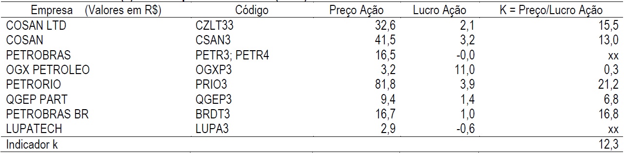 Onde se lê: xx: o fator K (Tabela 4), não foi calculado para empresas com índice Lucro/Ação negativo, pois o método é inviabilizado para empresas com prejuízo.
