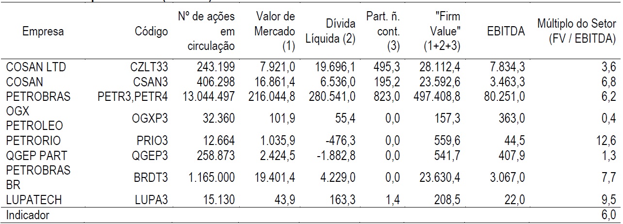 O método de Múltiplos de Segmentação Setorial considera o “Firm Value ou Enterprise Value”, que compreende o valor de mercado da empresa somado à dívida líquida e dividido pelo EBITDA (Tabela 6). O EBITDA irá tratar o pagamento das obrigações com os sócios, com terceiros (os credores de dívida) e as obrigações tributárias. Este método de avaliação relativizado é indicado como mais simples, rápido e considera a expectativa de mercado. Apesar de possuir algumas limitações, como desconsiderar a eficiência financeira, ele é muito utilizado pelo mercado. Na avaliação de valor da Petrobras (Tabela 7) ponderado pela geração operacional de caixa e desconsiderando os efeitos financeiros e tributários, por este método, o valor da empresa é assolado em 2014 em 87%, mas retoma no segundo ano subsequente.