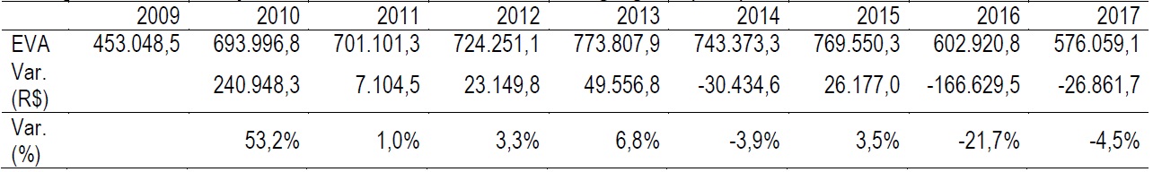 Segundo Wernke e Lembeck (2000, p. 86), o EVA é utilizado para calcular a riqueza criada em determinado espaço de tempo, buscando calcular a rentabilidade real do capital aplicado. Esclarecem ainda que “o EVA é um indicador do valor econômico agregado que permite a executivos, acionistas e investidores avaliarem com clareza se o capital empregado num determinado negócio está sendo bem aplicado.” Nesse método, as empresas são avaliadas com a seguinte equação, conforme Stewart (1990):