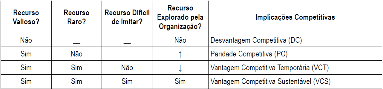 Para serem fontes de desempenhos superiores e, portanto, considerados estratégicos, os recursos devem dispor de algumas características (Barney, 1991). A primeira das características trata do valor. Recursos são valorosos quando permitem que uma empresa conceba e implemente uma estratégia para aproveitar oportunidades e neutralizar ameaças (Barney, 1991; Barney & Hesterly, 2007). A presença de recursos não-valiosos pode colocar a empresa em uma situação de desvantagem competitiva (DC) face aos competidores, enquanto que a presença de recursos valiosos, mas sem características de raridade ou de difícil substituição/ imitação, levaria a uma situação de paridade competitiva (PC) com os demais competidores do mercado (Barney & Hesterly, 2007).