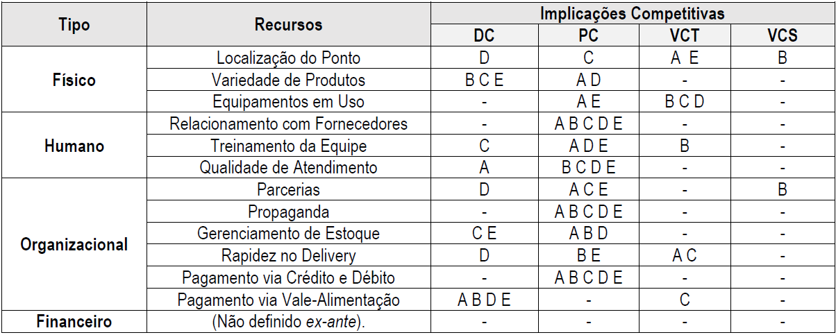 De início, serão apresentadas as análises referentes aos quinze recursos definidos ex-ante e comuns a todas as empresas participantes do estudo. A Figura 2 relaciona as implicações competitivas observadas no contexto de cada empresa participante do estudo.