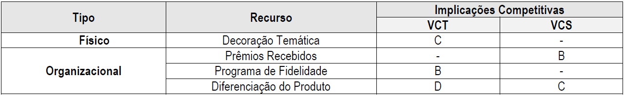 Tais recursos, ainda que valiosos, estavam igualmente presentes em todas as empresas, gerando uma situação de paridade competitiva. Sob uma perspectiva prática, esses recursos podem ser entendidos como um conjunto mínimo de características que uma empresa que busca adentrar esse setor deve cumprir para o seu bom funcionamento. Ainda que esses recursos não gerem uma vantagem sobre a concorrência, sua ausência ou sua má qualidade pode representar uma situação de desvantagem competitiva para o empreendimento. Um subconjunto mais restrito de recursos foi identificado como capaz de gerar alguma vantagem competitiva às empresas. Diversos recursos foram apresentados pelas empresas como não presentes em seus concorrentes, contudo facilmente emulados ou substituídos por recursos similares.