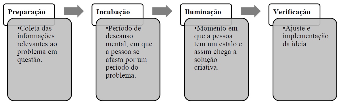 O processo pelo qual a criatividade é concebida tem recebido especial atenção na literatura. O primeiro modelo do pensamento criativo seguiu a linha antropocêntrica do início do século XX. A criação de uma nova ideia seguia quatro etapas, conforme mostra a Figura 1 (de Alencar, 1995, citando Wallas, 1926).